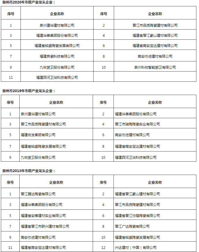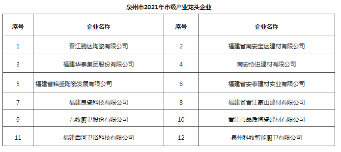 其中,建材家居行業(yè)中,協(xié)進、九牧等12家福建陶衛(wèi)企業(yè)進入2021年泉市級產業(yè)龍頭企業(yè)項目名單。