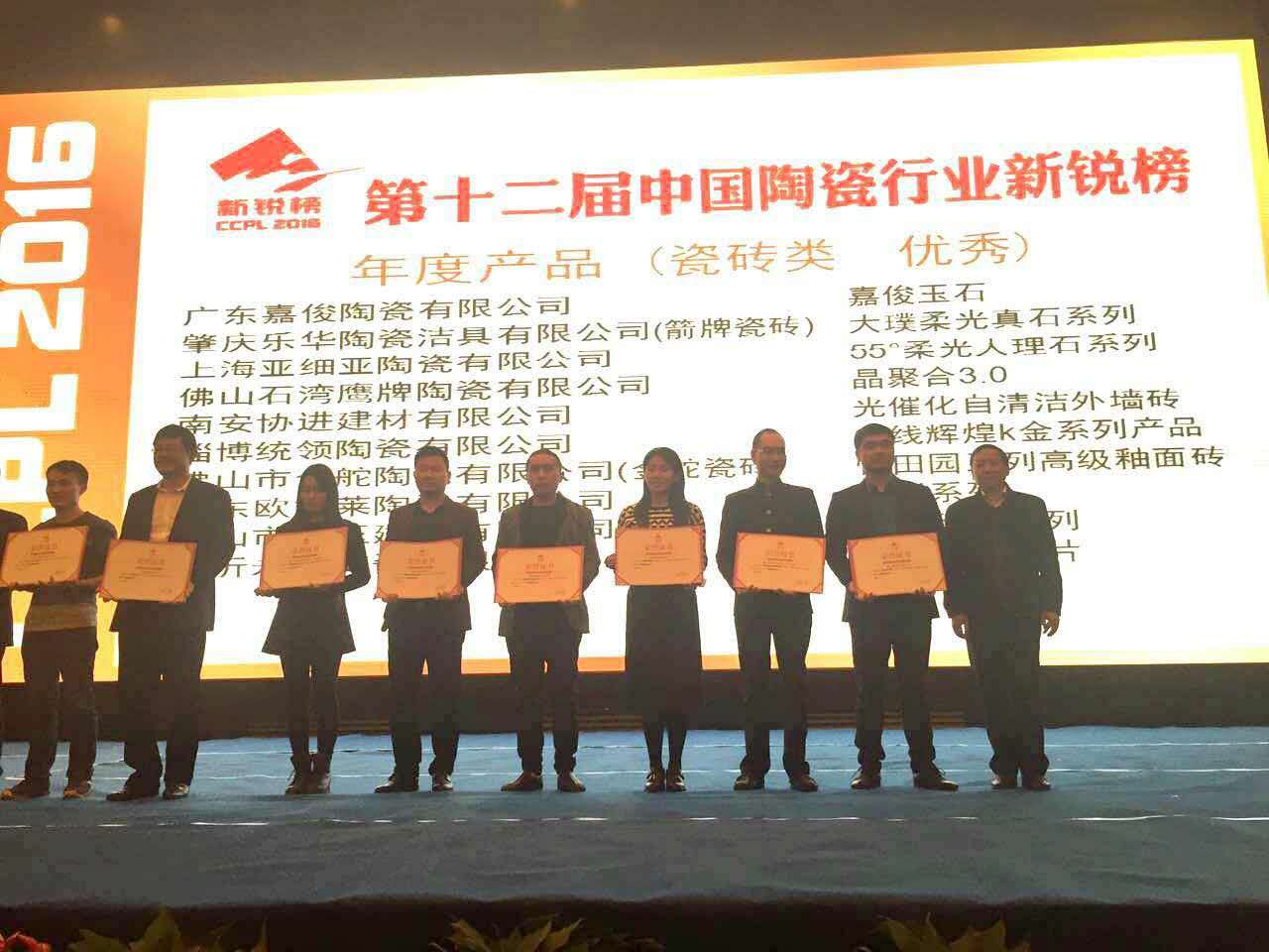 熱烈祝賀南安協(xié)進(jìn)建材有限公司的“光催化自清潔外墻磚”在第十二屆中國陶瓷行業(yè)新銳榜評選活動中,榮獲“年度優(yōu)秀產(chǎn)品”。