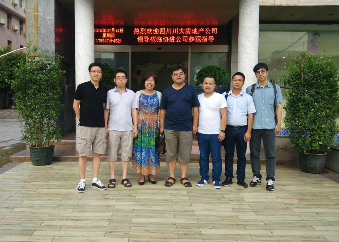 2016年7月14日下午,四川川大房地產(chǎn)公司領(lǐng)導一行四人赴我協(xié)進公司參觀考察。我司楊副董事長、營銷中心林副總及成都經(jīng)營部但經(jīng)理熱情接待了來訪貴賓。首先參觀了公司展廳,了解公司的常規(guī)產(chǎn)品及陶瓷薄板、古典藝術(shù)磚、地爬墻仿古小地磚等特色產(chǎn)品,隨后在會議室進行公司概況的介紹和產(chǎn)品知識、成功案例的交流。